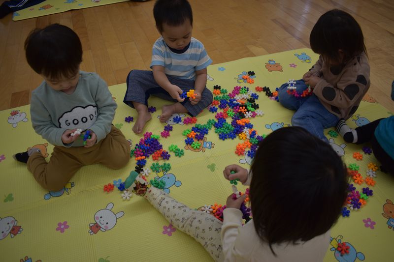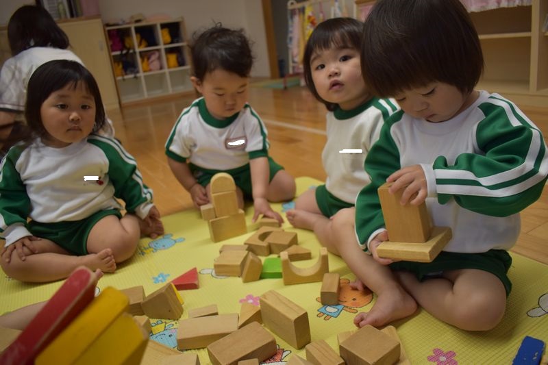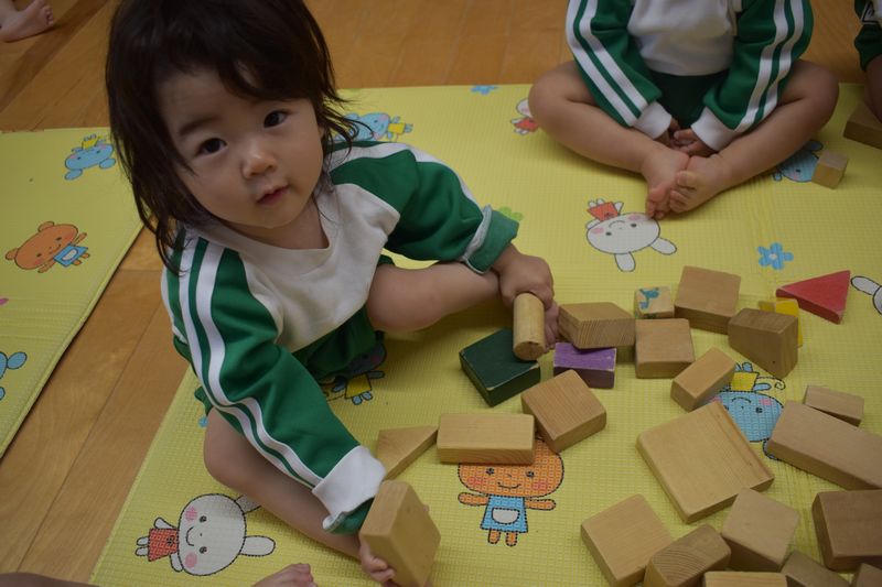 すみれぐみのお友だちはブロック遊びが大好きです(⋈◍>◡<◍)お友だちや先生と一緒に高く積み上げたり「パンにバター塗るの」と言ってごっこ遊びをしたり・・・遊びの展開を自分たちで広げることができるのでいつも感心しています✨