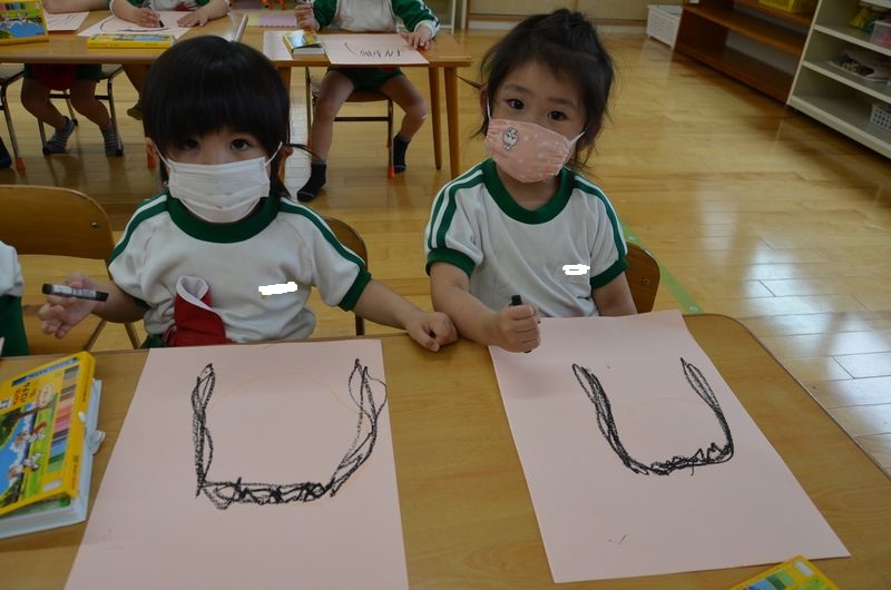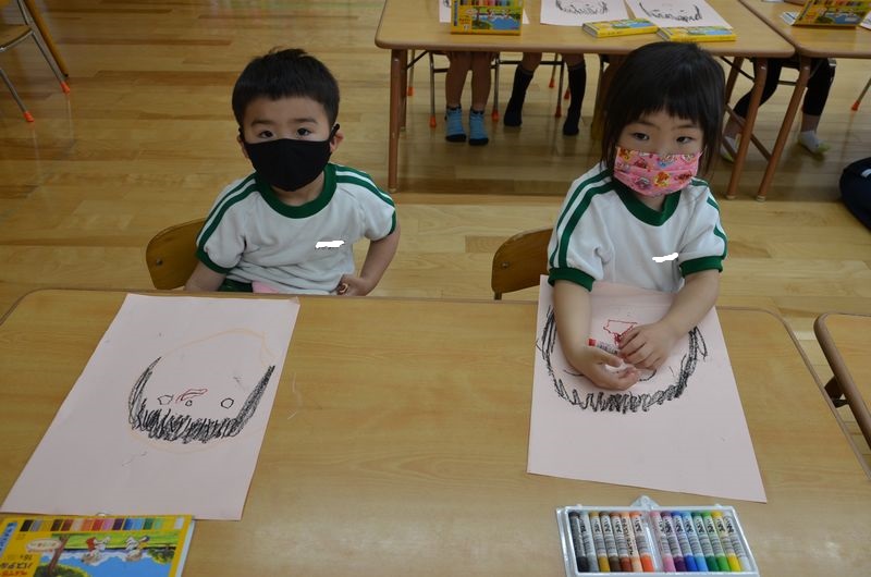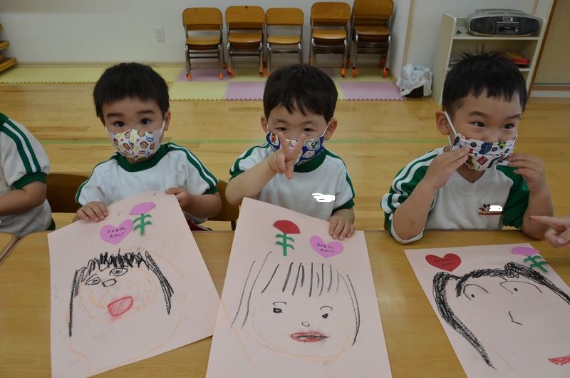 今日は5月の製作でクレパスを使いお母さんの似顔絵を描きました☆彡大好きなお母さんの顔を思い浮かべていつもありがとうという感謝の気持ちを込めて一生懸命に描いた3歳児さんです(*^-^*)