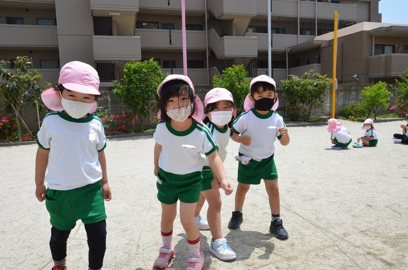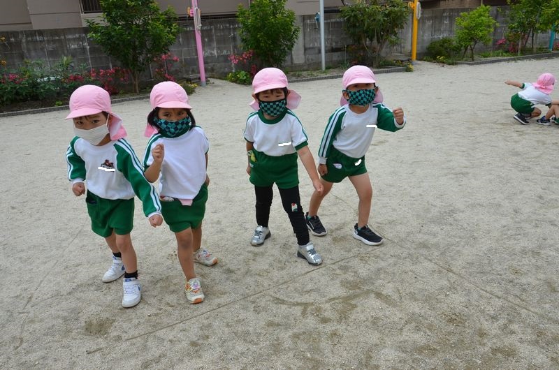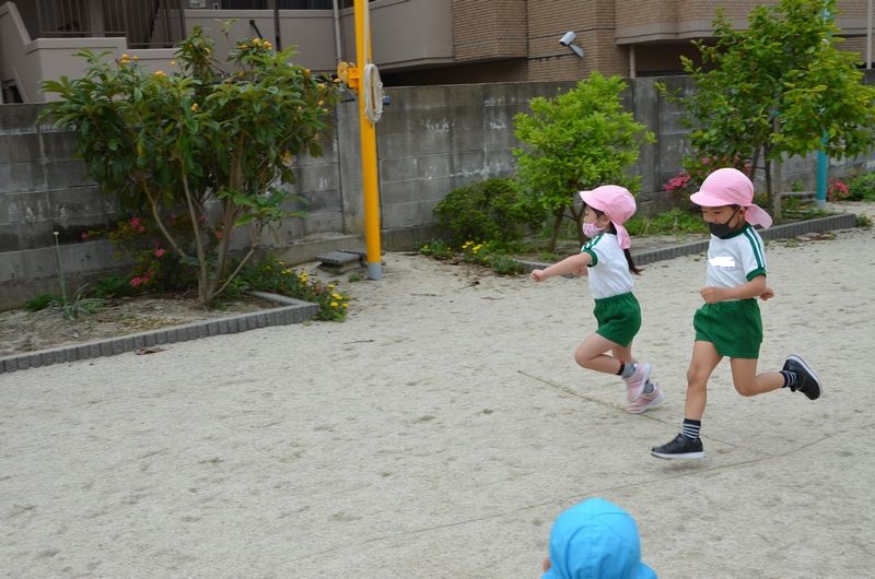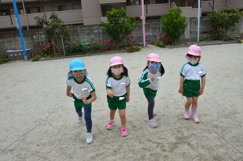 4歳児さんは戸外遊びが大好きです!今日はかけっこを行いました。スタート位置でのかっこいい構え!ゴールまでしっかりと走り切る姿!とってもステキです!(^^)!