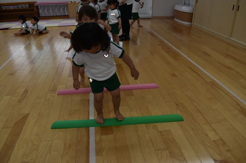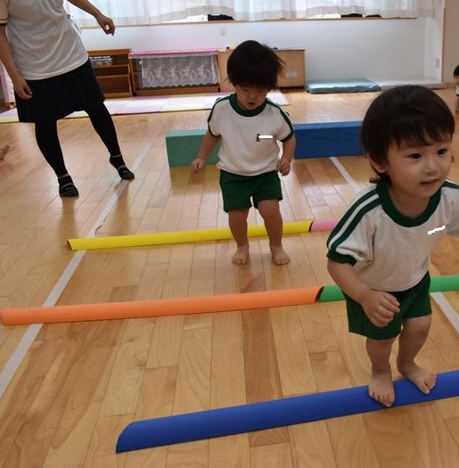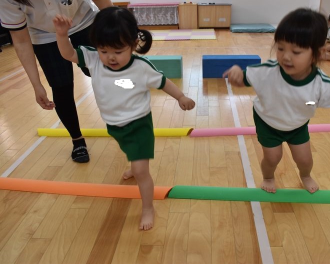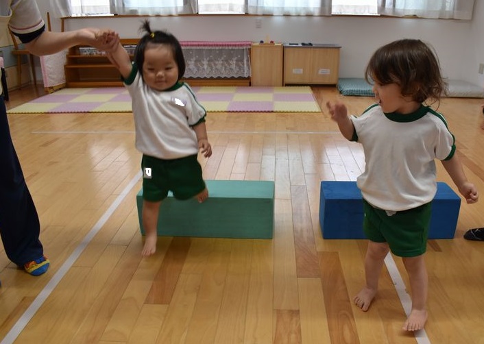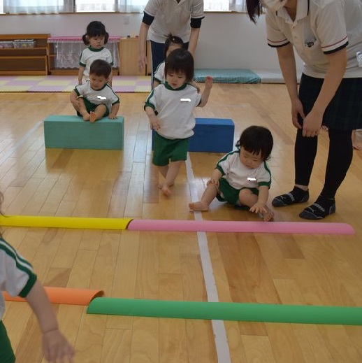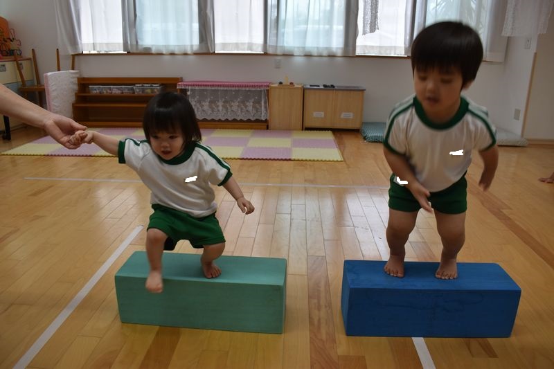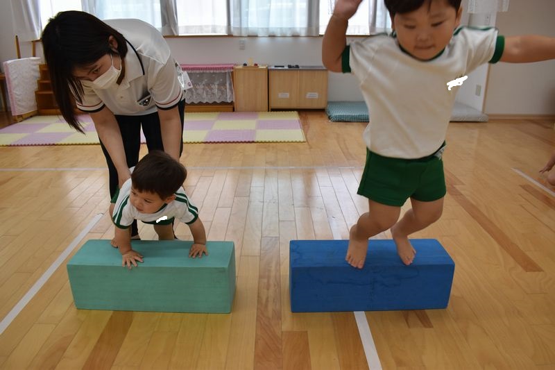 今日は、脚力などを鍛えていけるよう運動遊びを行いました。2歳のお友達は最初から最後まで一人でジャンプでクリアしていきました!1歳のお友達はカラーブロックに一人でよじ登ることが出来ていました!先生と手を繋いでのジャンプも楽しみました(#^^#)