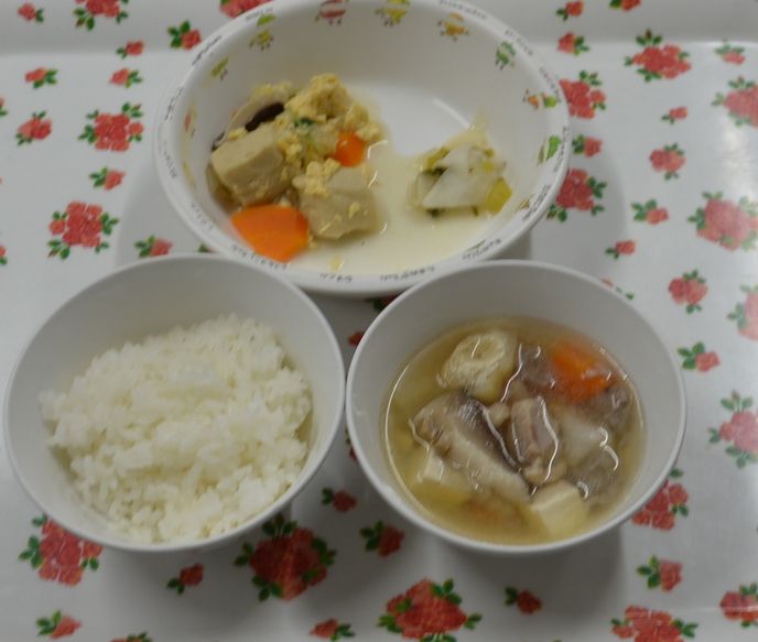 白飯、けんちん汁、高野豆腐の卵とじ、カブの酢の物