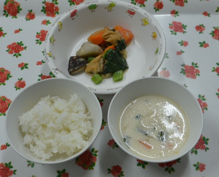 白飯、チンゲン菜のミルクスープ、がんもどきの中華風うま煮