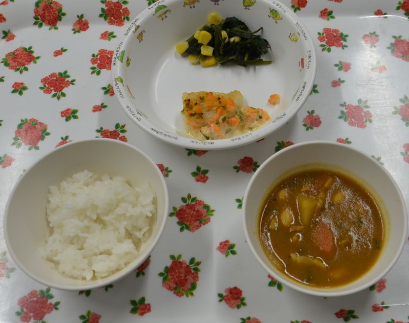 白飯、大豆のカレースープ、魚のもみじ焼き、青菜ソテー
