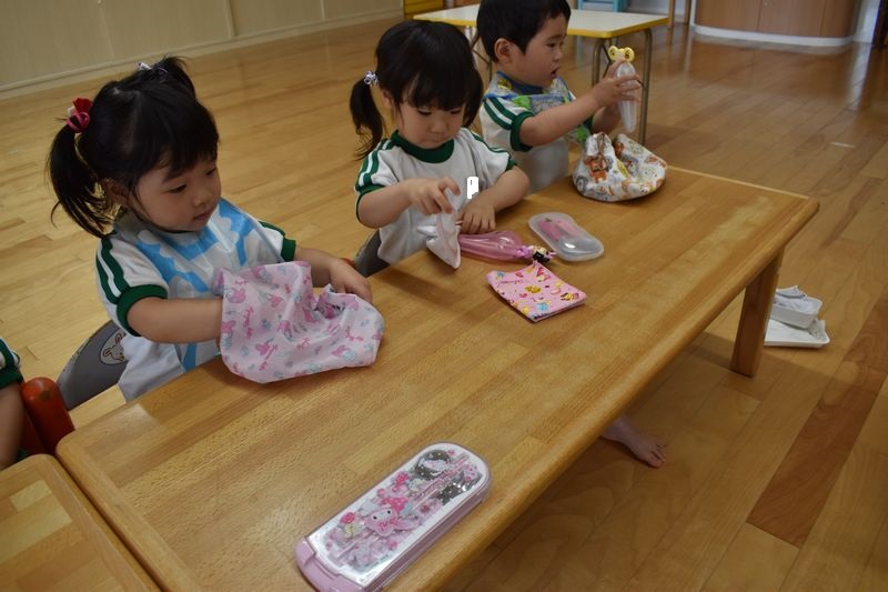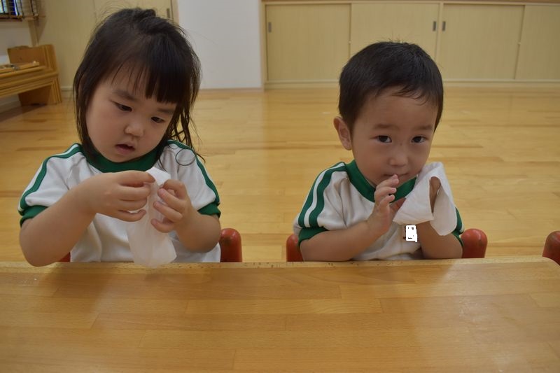 たんぽぽ組の1歳児さんは給食の準備は自分たちで出来るようになりました!ナフキンを広げたり自分たちで準備してます。2歳児さんはお手拭きを四角くたたむ事が出来るようなり「四角くしてね~♪」と言いながら自分でたためるようになりました。毎日、子どもたちのいろいろな成長を感じています!