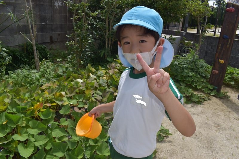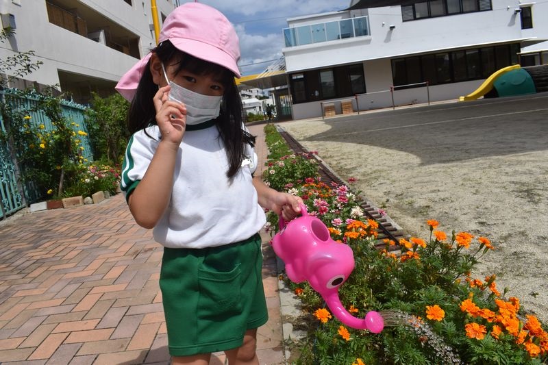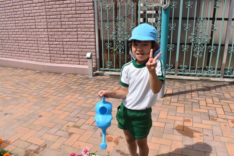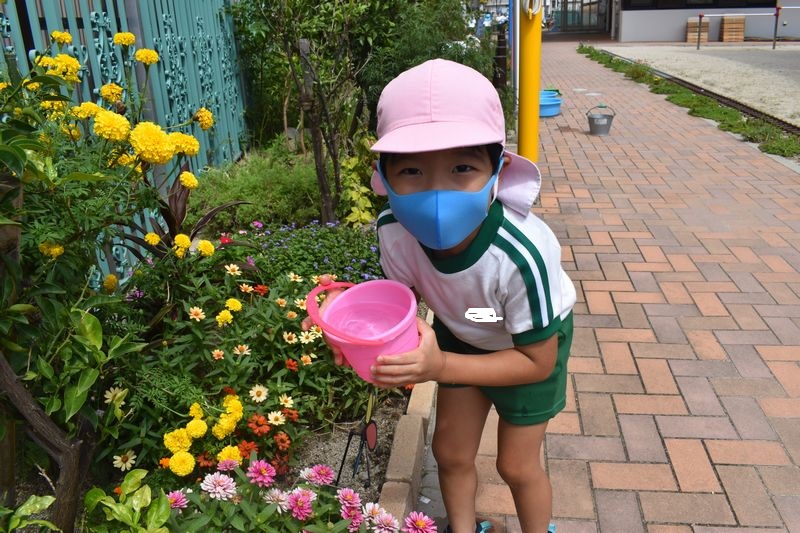 9がつに入りましたがまだまだ暑い日が続いています。今日は午後から水やりをしました。ひしゃくやじょうろやバケツを使いお友達と仲良く協力しながら水やりを楽しんだ4歳児さんでした(*^-^*)