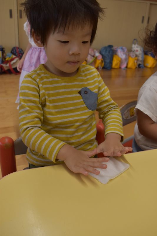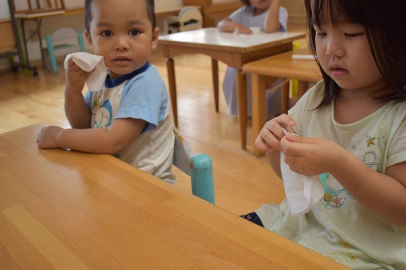 給食やおやつの前は除菌おしぼりで手や口を拭いています。1歳児さんも先生たちがつかなくても四角形にたたむ事が出来るようになりました。日々の成長に保育士も嬉しく思います(*^-^*)