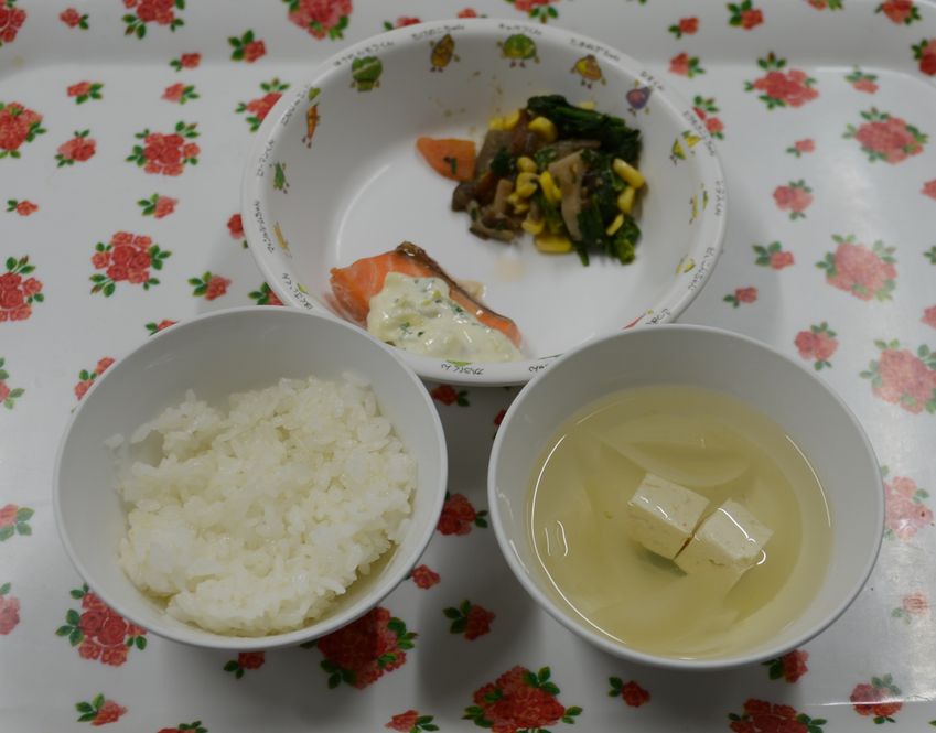 白飯、清汁、魚のサワーソース焼き、中華風精進炒め