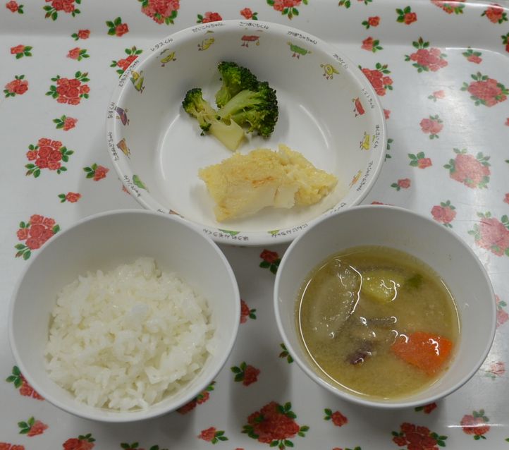 白飯、さつまいも汁、魚のマヨネーズ焼き、ブロッコリーのごま和え