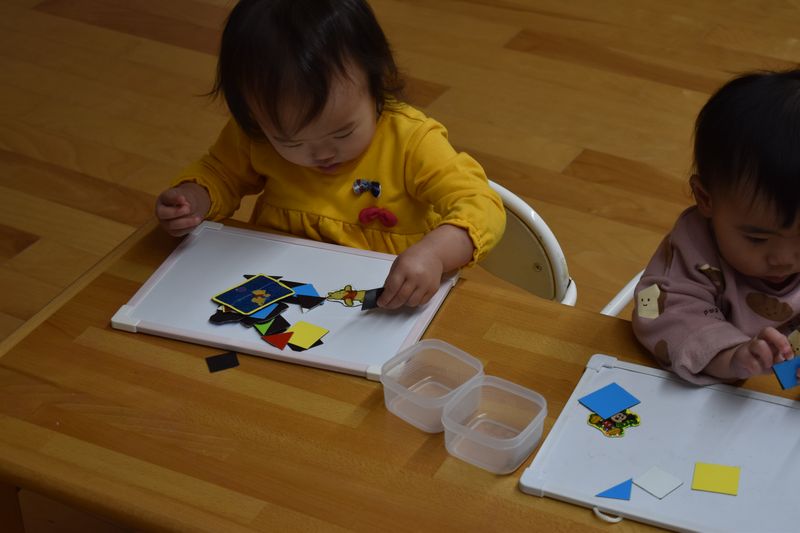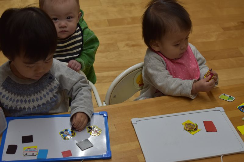 マグネットは板につくのが不思議みたいで夢中になってペタペタとしていました(*^-^*)色んな遊びを集中して出来るようになってきているつぼみ組さんです。