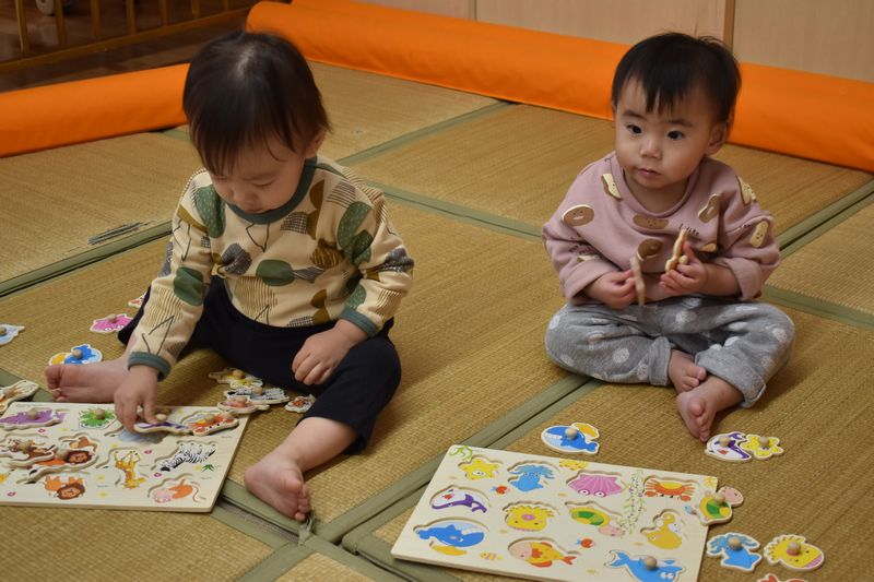 つぼみ組さん達は今日は型はめパズルとマグネット遊びをしました。型はめパズルはバナナはどこだ?と聞こえてくるよう首をかしげたりしながら同じ絵柄を真剣に探してました!