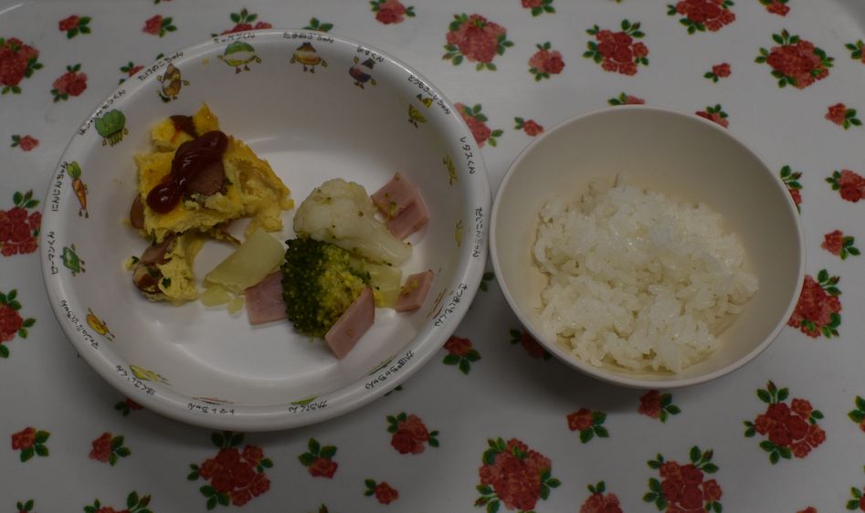 白飯、ウィンナーのオムレット、カリフラワーとブロッコリーのサラダ