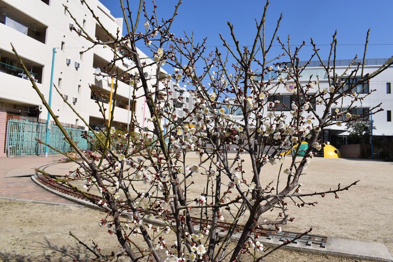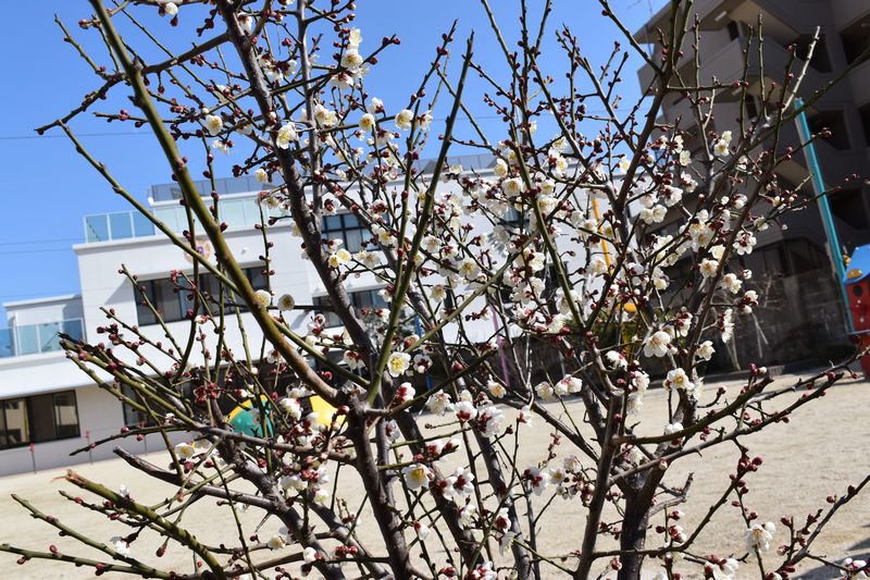 寒い日が続く中、園の梅の木が今年も花を付けました(*^-^*)子供たちも「お花咲いてる~」「なんの花?」と興味深々です。どんどん咲く梅の花に癒されます(*'▽')