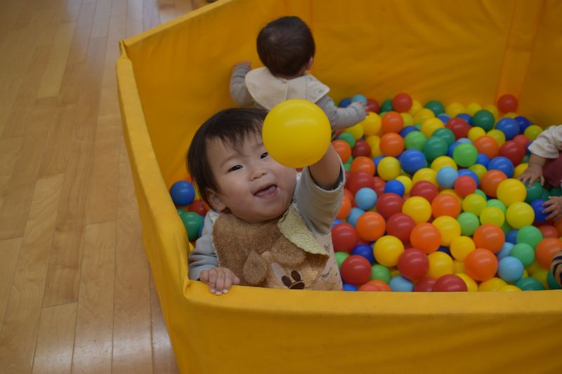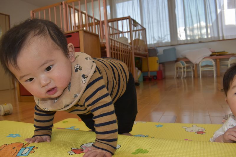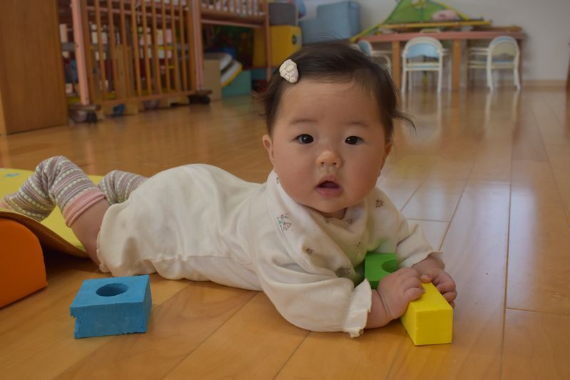 入園してまもなく1ケ月がたち入園当初は大泣きの大合唱でしたが少しずつ園にも慣れマットの上でハイハイしたりボールやおもちゃで遊ぶ姿がたくさん見られるようになりました。
