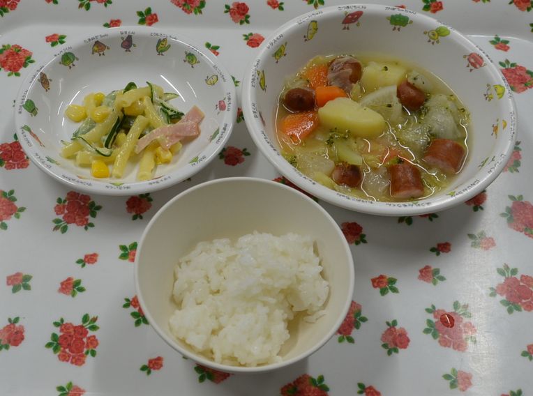 白飯、ポトフ、マカロニサラダ