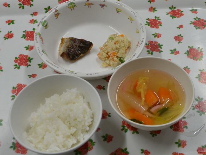 白飯、七草汁、魚の照り焼き、うの花の炒り煮