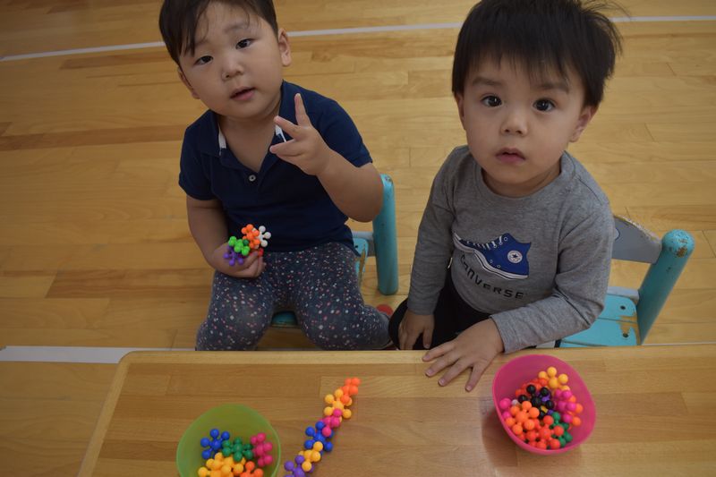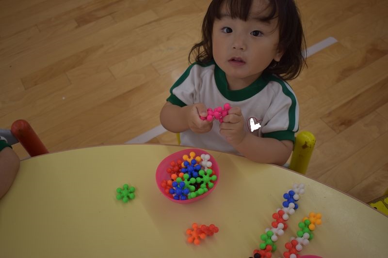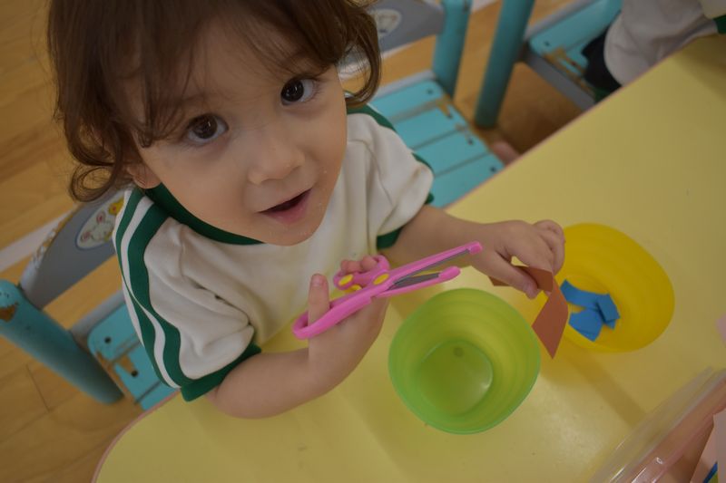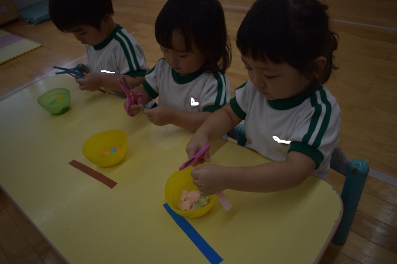 花ブロックとはさみの練習をしました!花ブロックは同じ形のブロックを組合わせて形を作るため想像力を育みます。はさみの練習を初めてはさみは新鮮なのか時間いっぱい夢中でチョキチョキと切っています。紙やハサミの持ち方、切り方など安全に使えるようにしています。
