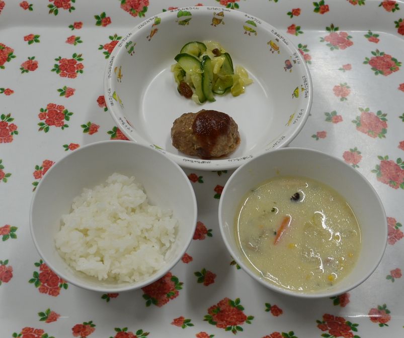白飯、きのこと豆乳のコーンスープ、ハンバーグ、フレンチサラダ