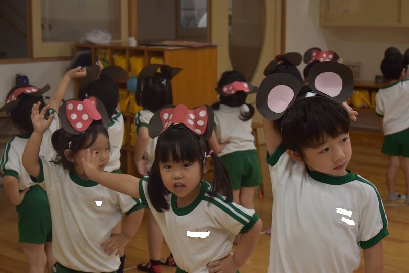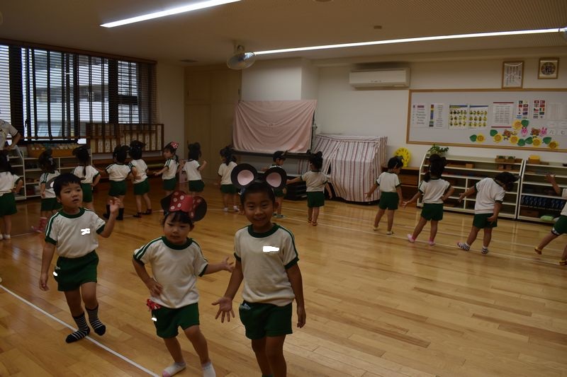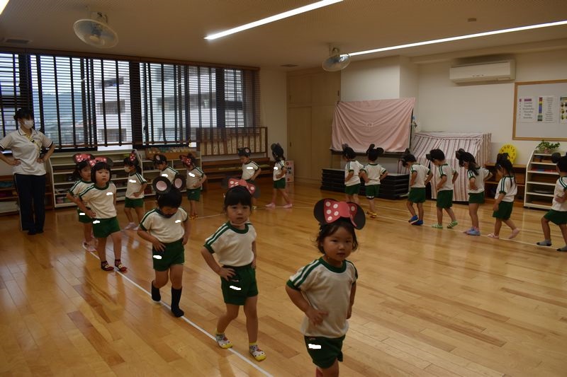 うんどう会で披露するミッキーマウスマーチのダンスの練習を今日は雨なので室内でしました。今日ははじめてミッキーとミニーのお耳を付けて練習しました。子供たちはミッキーやミニーになりきっていつも以上に張り切って踊っていましたよ!