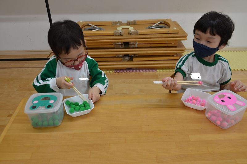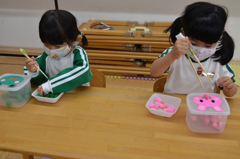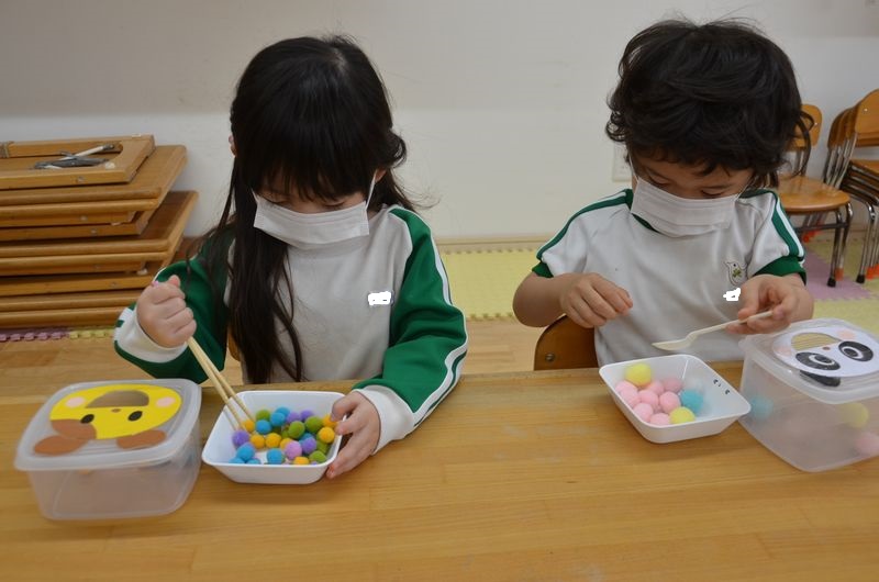 モンテッソーリの教具「あけ移し」に取り組んでいる3歳児さん!箸やスプーンを使って小さなモールを容器にうつしていきます。楽しみながら正しいスプーンの握り方や箸の持ち方も学んでいます✨