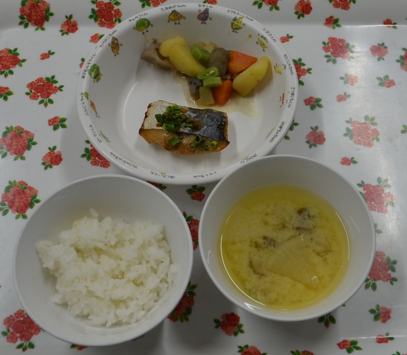 白飯、みそ汁、魚の香味焼き、筑前煮