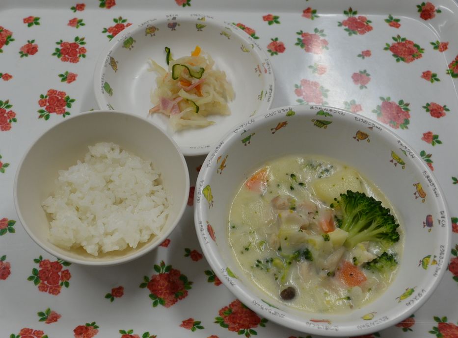 白飯、鶏とブロッコリーのクリーム煮、切干大根サラダ