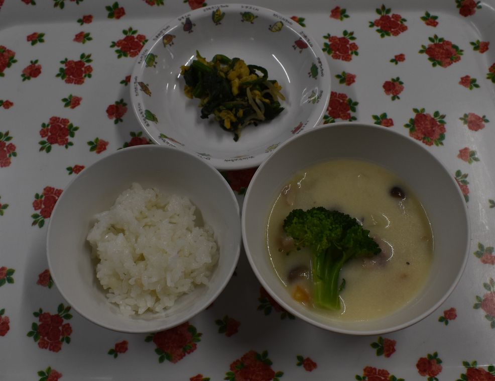 麦ごはん、鶏肉のブロッコリーのクリーム煮、菜の花和え