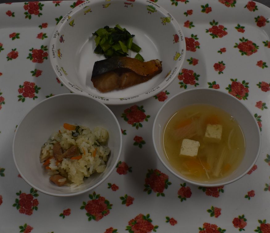 わかめご飯、洋風みそ汁、さばのカレー煮、小松菜