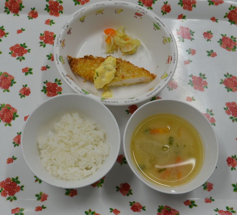 白飯、豚汁、ささみフライ、きゃべつ