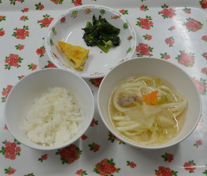 白飯、けんちんうどん、千草焼き、青菜のごま和え