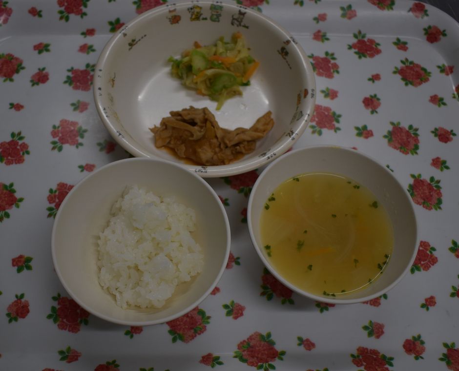 白飯、コーンスープ、ポークソテー、春キャベツの和え物