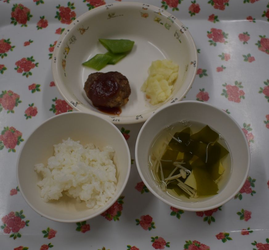 白飯、若竹汁、豆腐ハンバーグ、マッシュポテト、スナップエンドウ