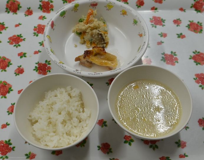 白飯、コーンスープ、鶏のママレード焼き、うの花の炒り煮