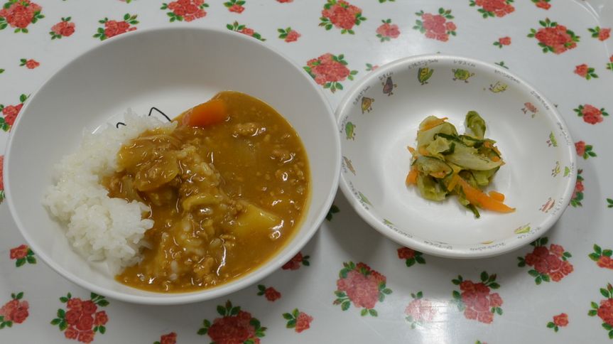 カレーライス、春キャベツの和え物