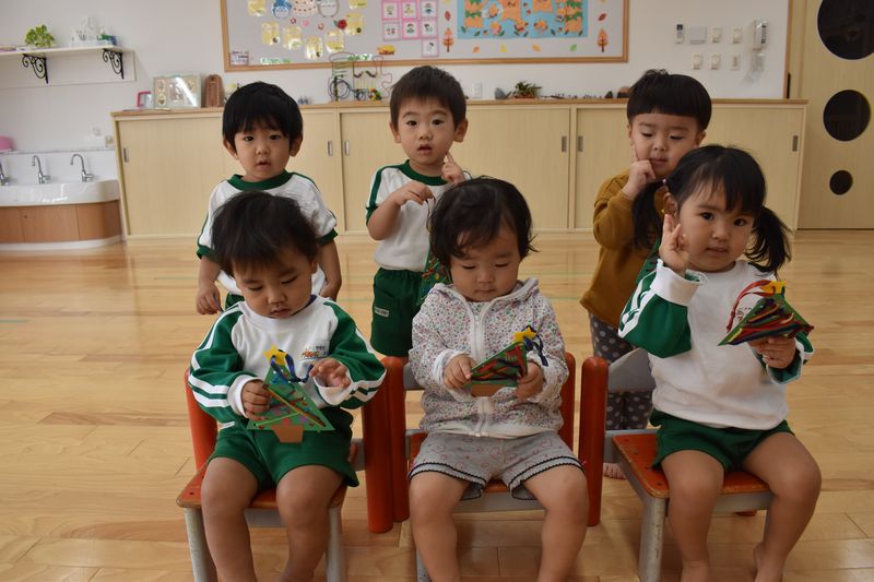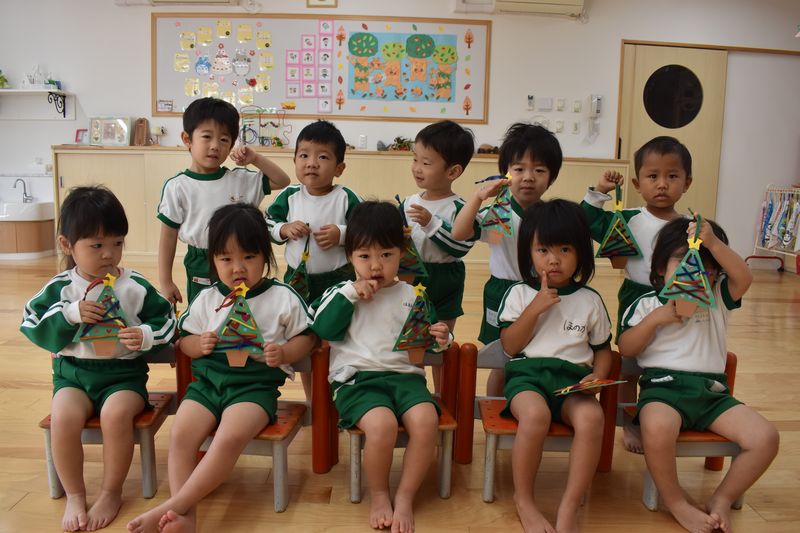 ひも通しのクリスマスツリーが出来上がりました。クリスマスには、みんなで飾ります。