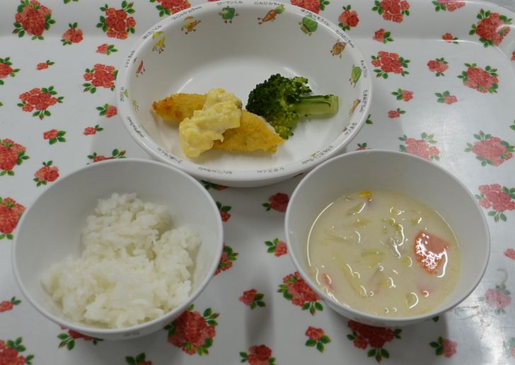 白飯、クリームスープ、ささみフライ(タルタルソース)、ブロッコリー