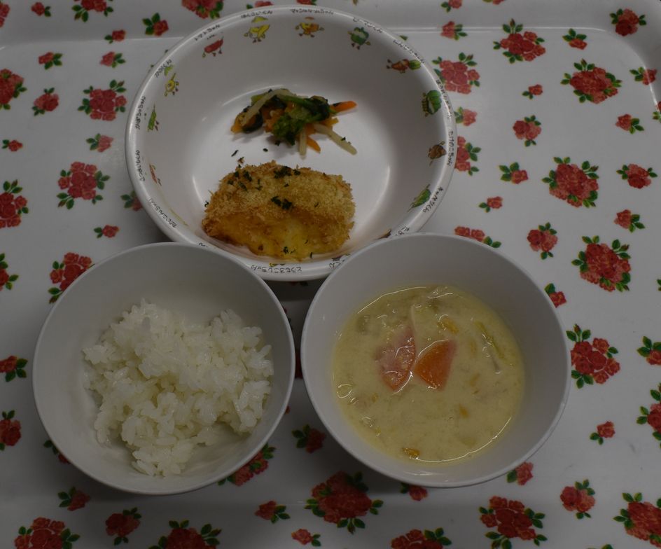 白飯、キャベツとコーンの豆乳スープ、魚のパン粉焼き、青菜のごま和え