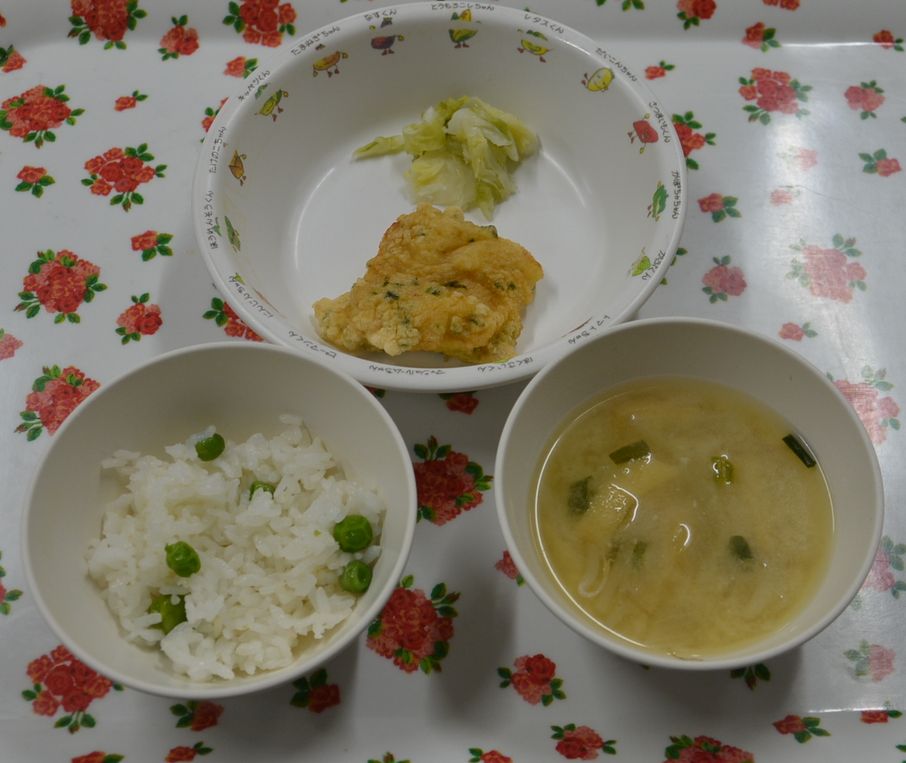 ピースご飯、季節の具沢山みそ汁、魚の新緑揚げ、ボイルキャベツ