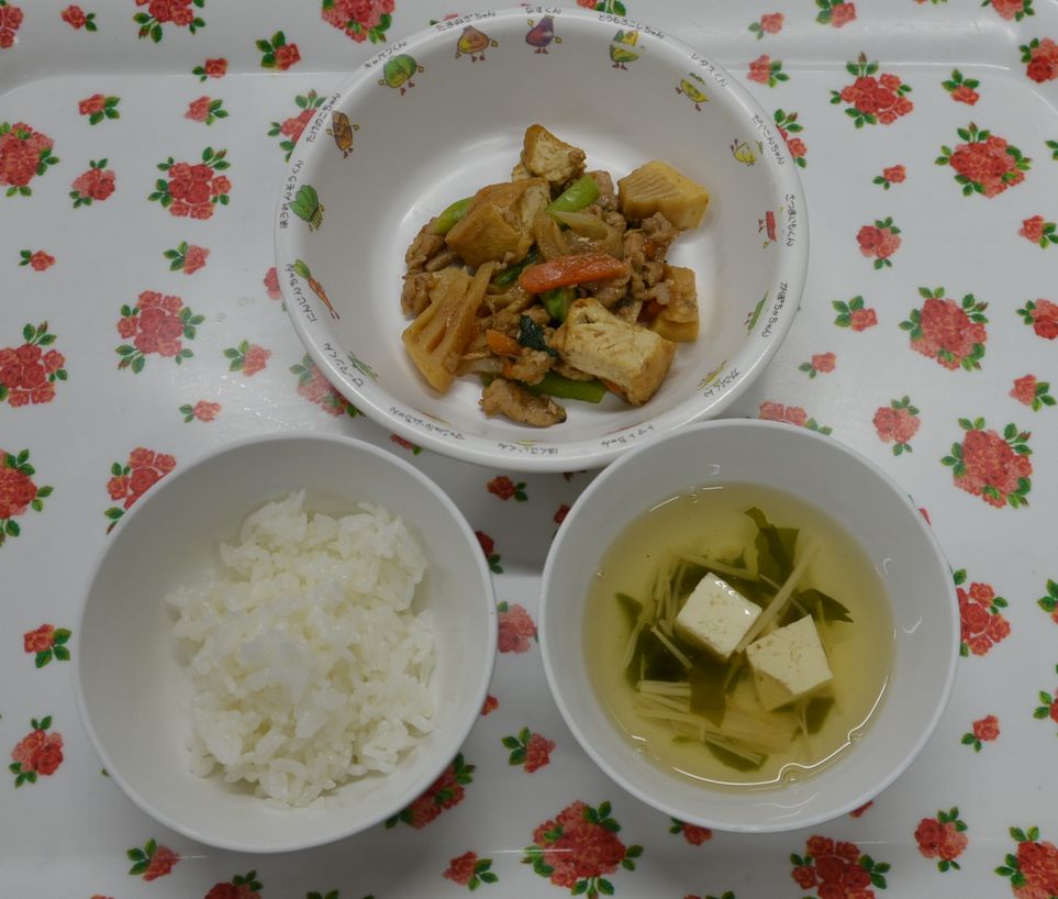 白飯、豆腐の清汁、豚肉と春野菜の赤みそ炒め