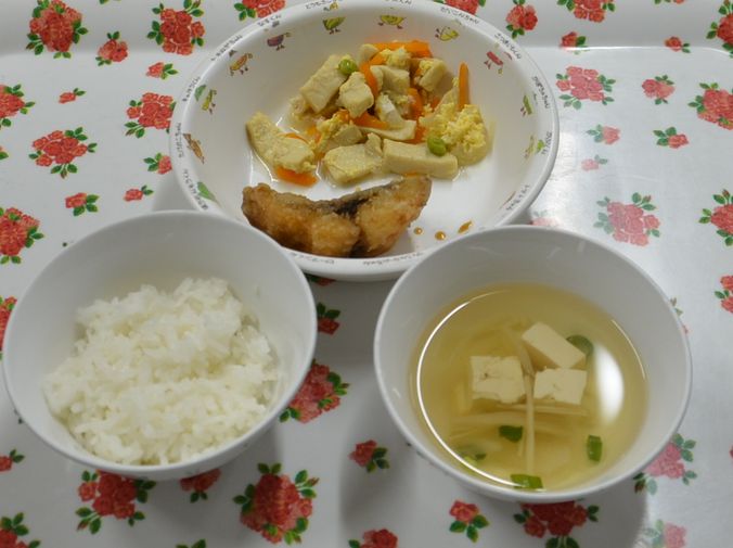 白飯、清汁、魚のかば焼き、高野豆腐の卵とじ