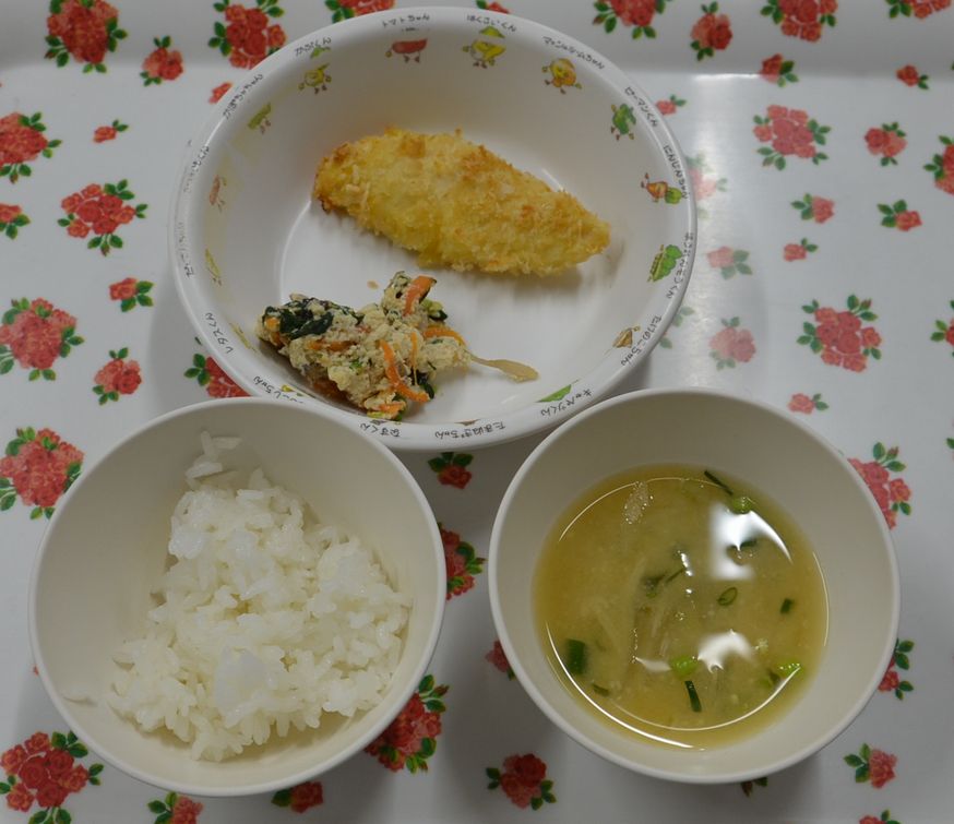 白飯、みそ汁、ササミフライ、白和え