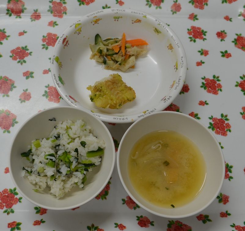 じゃこ飯、みそ汁、魚の新緑揚げ、和風サラダ
