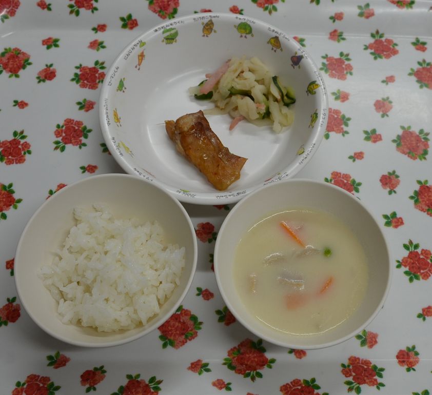 白飯、チキンクリームシチュー、鶏の照焼き、切干大根サラダ