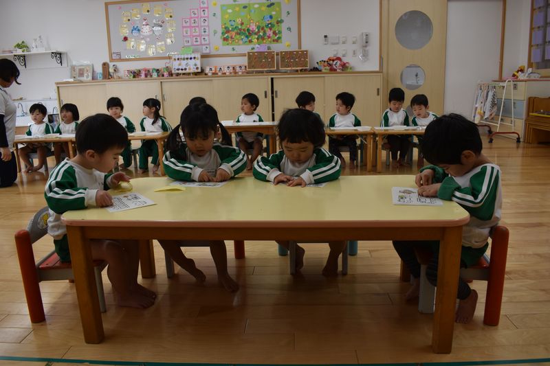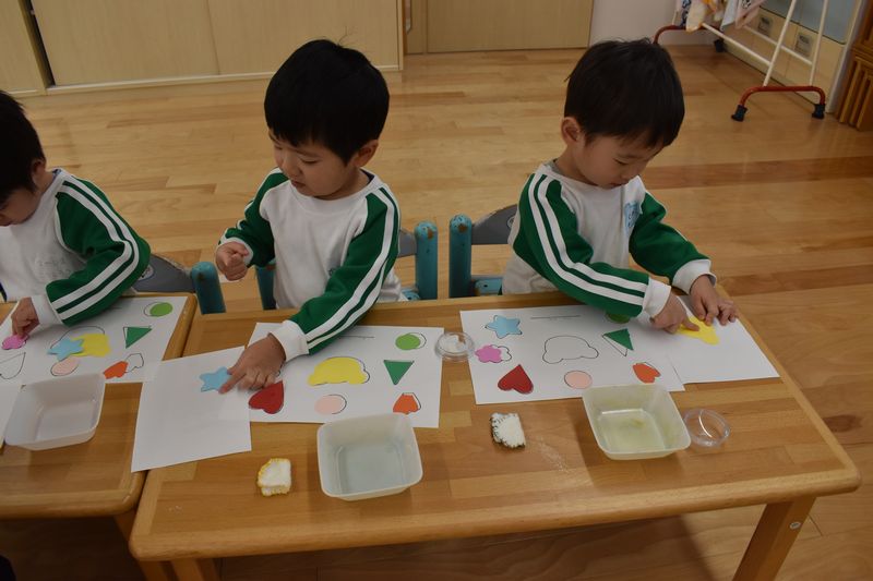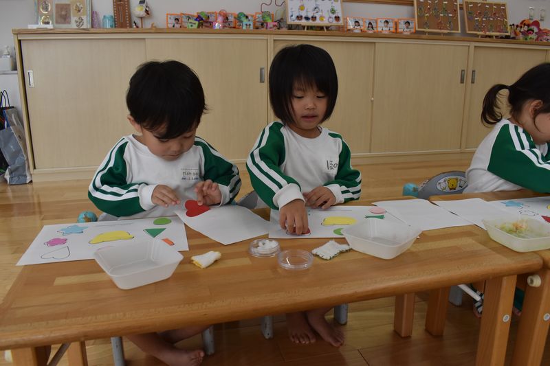 2歳児さんはのり貼りを体験しました。のりを指に付けて感触を楽しんだり伸ばしていったり、型に合わせてパズルのようにのり貼りを楽しんでいました。1歳児さんはシール貼りを楽しんでいます。みんな集中して取り組んでいます。