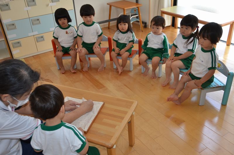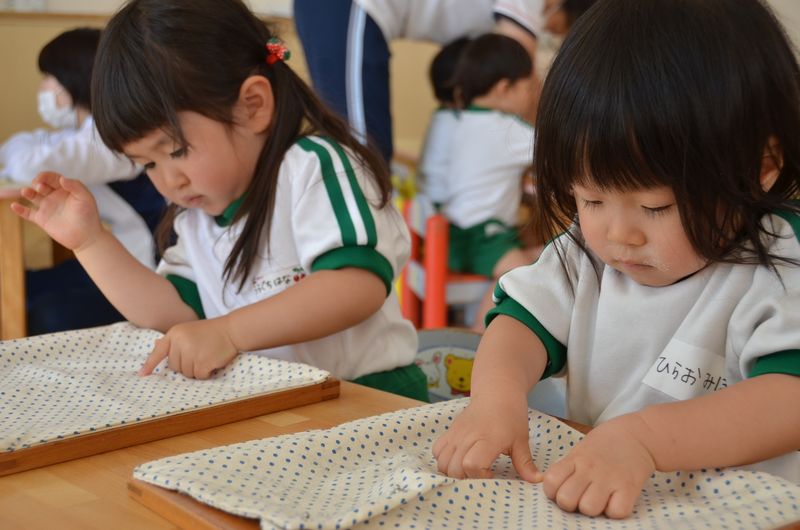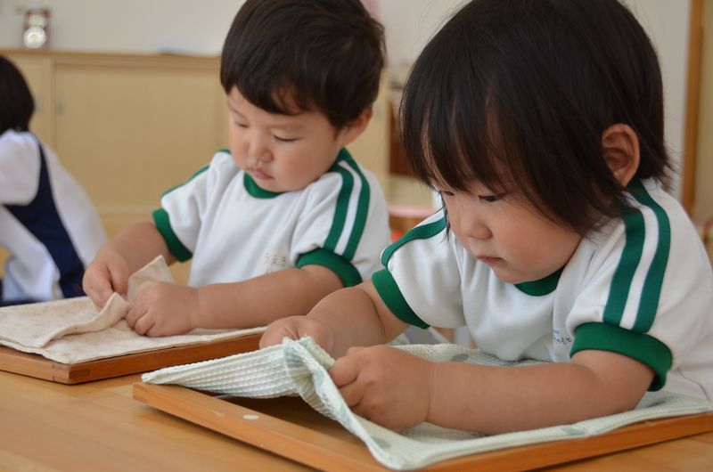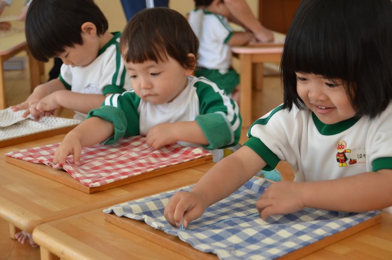 ボタン留めに興味を示している子供たちにモンテッソーリ教具の着衣枠を紹介しました。子供たちはとても集中して取り組んでいましたよ。「次は何にチャレンジしてもみようかな?」