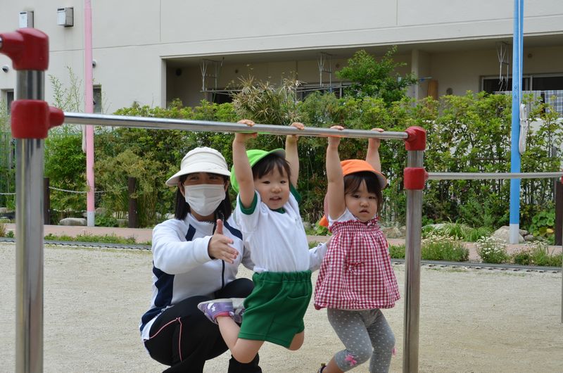 鉄棒ぶら下がりに挑戦中♪体をしっかり動かし体力づくりをがんばっています。だんだんと長い時間ぶら下がれるようになっています!