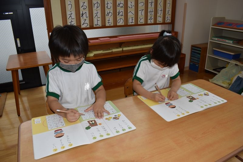 4歳児さんはひらがなの書き方練習を始めています。鉛筆の持ち方や姿勢もきれいになってきています。