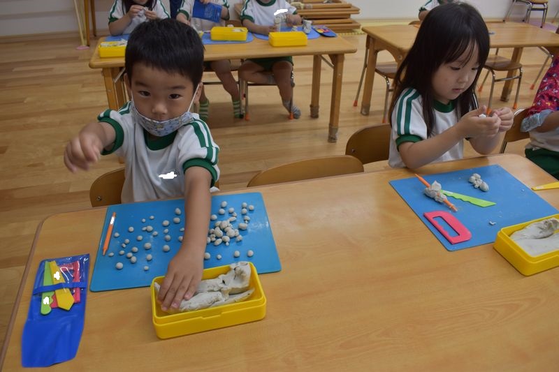 3歳児は今年度より以上児クラスになり自分用の粘土&粘土ベラを持ちました。粘土をたくさん丸めたり平たく伸ばしたりみんなそれぞれ作りたい形に挑戦!どんどん上手になっています。粘土でたくさん楽しんだ後はしっかり手洗いをしています。手洗いもとっても上手になりましたよ(^^♪