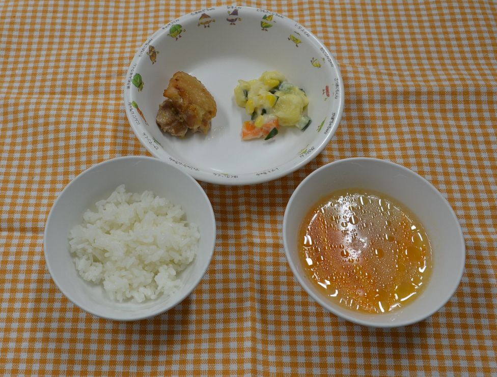 白飯、ミネストローネ、鶏の照り焼き、マセドアンサラダ