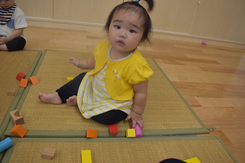 積み木を積んでもらってはそれを崩して楽しんでいるつぼみ組さん(^^♪ 使った後は型はめをして片付けています。