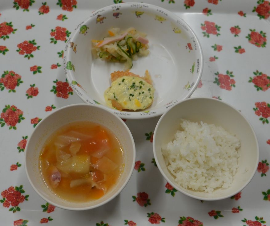 白飯、ミネストローネ、ムニエル、切干大根サラダ